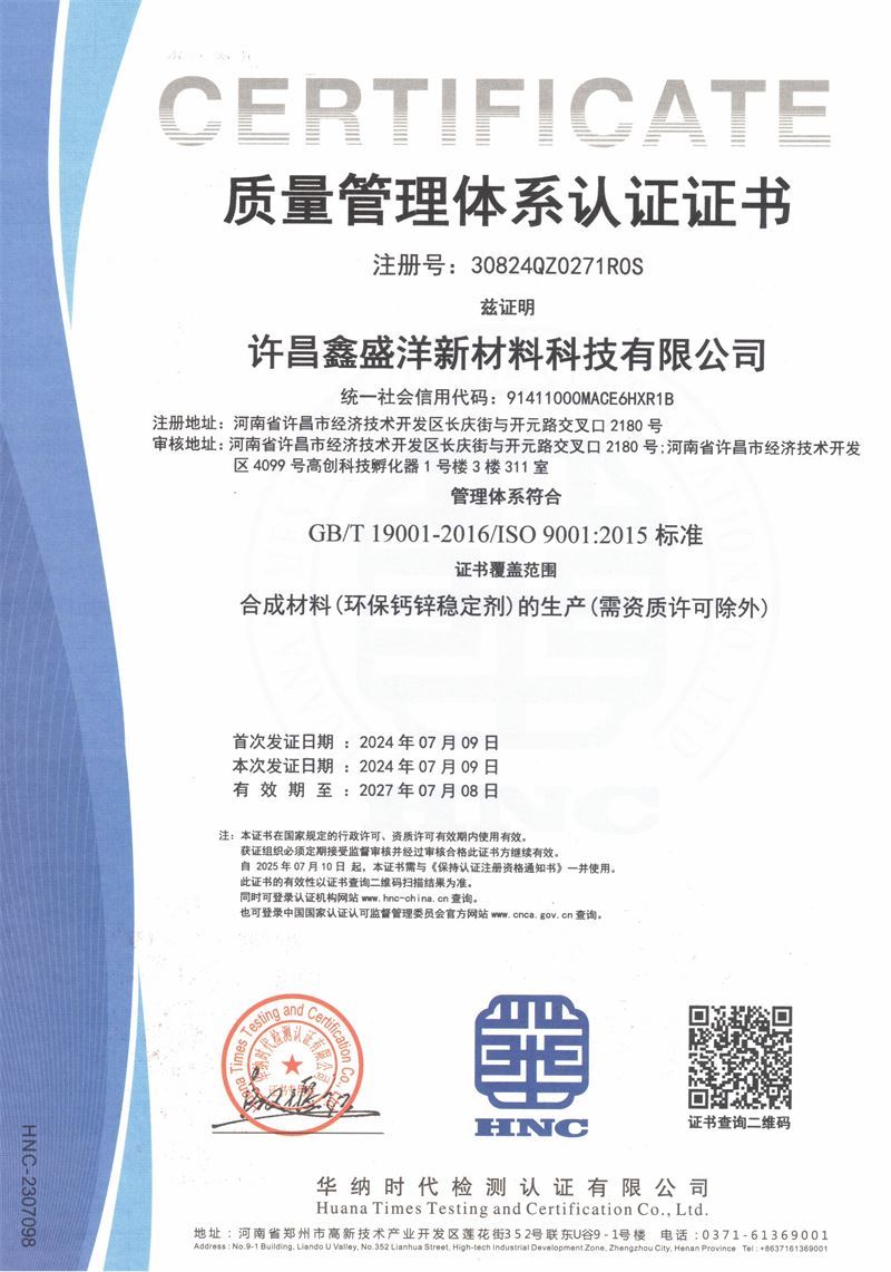 公司擁有江山亞盛新材料科技有限公司和許昌鑫盛洋新材料科技有限公司兩個生產基地,秉承“客戶至上、質量、服務至上”的理念,贏得了廣大客戶的一致好評。公司是一家專注于PVC高端穩定劑研發、制造和銷售的綜合性工廠,提供全方位的技術服務。目前公司擁有PVC電線電纜、PVC玩具注塑成型、PVC硬管、管件、型材、發泡制品、PVC鞋材、透明制品等環保穩定劑,可滿足市場上大多數PVC制品的使用。 公司現有員工80余人,專業研發人員6人,PVC環保穩定劑自動化生產線4條,生產能力5萬噸/年。 25年的技術研發經驗, 專業的研發設備,完善的質量體系,熱忱的服務為您提供更好的產品和服務。
